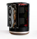 Unlike the Mac Pro, which features a cylindrical design with key components arranged along three sides of a triangular structure, with cooling machinery taking up its center; the Dune Case takes a different approach. It's spit into three compartments vertically along the bore of the cylinder, with the center holding a mini-ITX motherboard, one side with room for a full-height yet under 185 mm graphics card (connected to the motherboard through a PCIe riser); and the third compartment holding two 2.5-inch drives. A custom rear panel plugs into your motherboard, and an SFX power supply (not included) fuels your build. The main air channel is a 140 mm spinner that spouts warm air from the top.
