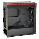 The PC-J60's default configuration includes two 120mm intake fans drawing cool air directly to the expansion cards through large vents flanking the entire front panel. Another large 140mm fan sucks some of this air downward into the PSU compartment over the drive racks, and is vented via the power supply in the back. On the top panel, this case can mount an addition three 120mm fans, or water cooling radiators fitting 430mm length, 160mm width, and 60mm thickness. All of the included fans and fan mounts feature removable mesh air filters.